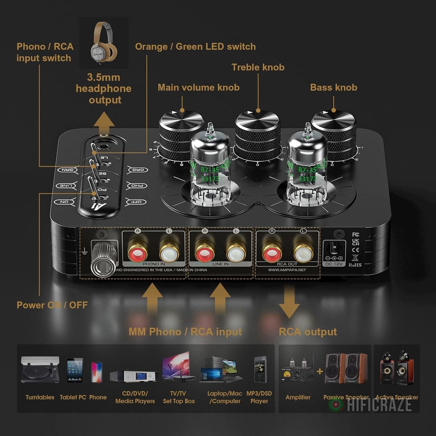 Specification: A1 Vacuum Tube Phono Preamp, Headphone Amp, Hi-Fi Audiophile Preamplifier for MM Turntable Record Player with Tone Control for Home Stereo Audio System