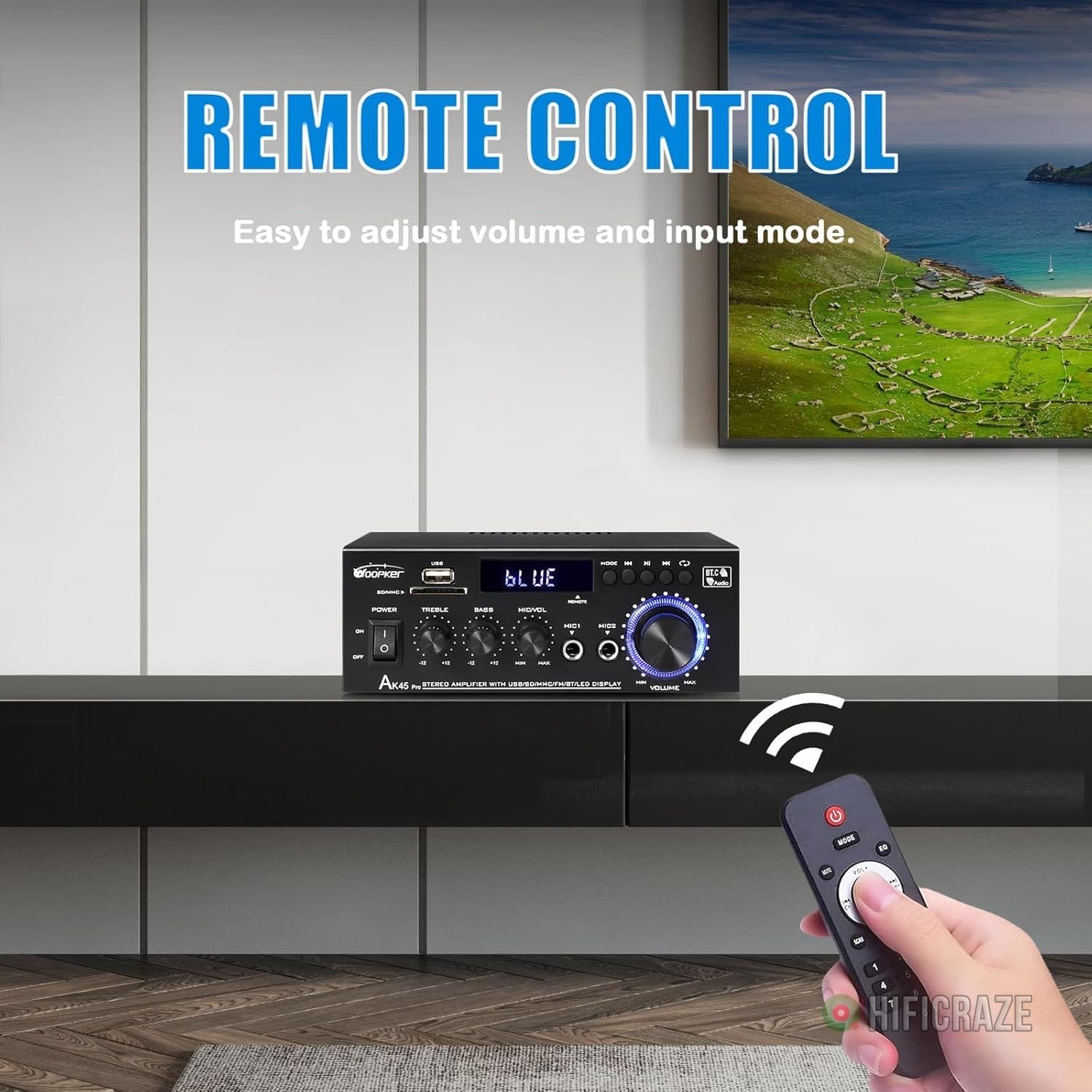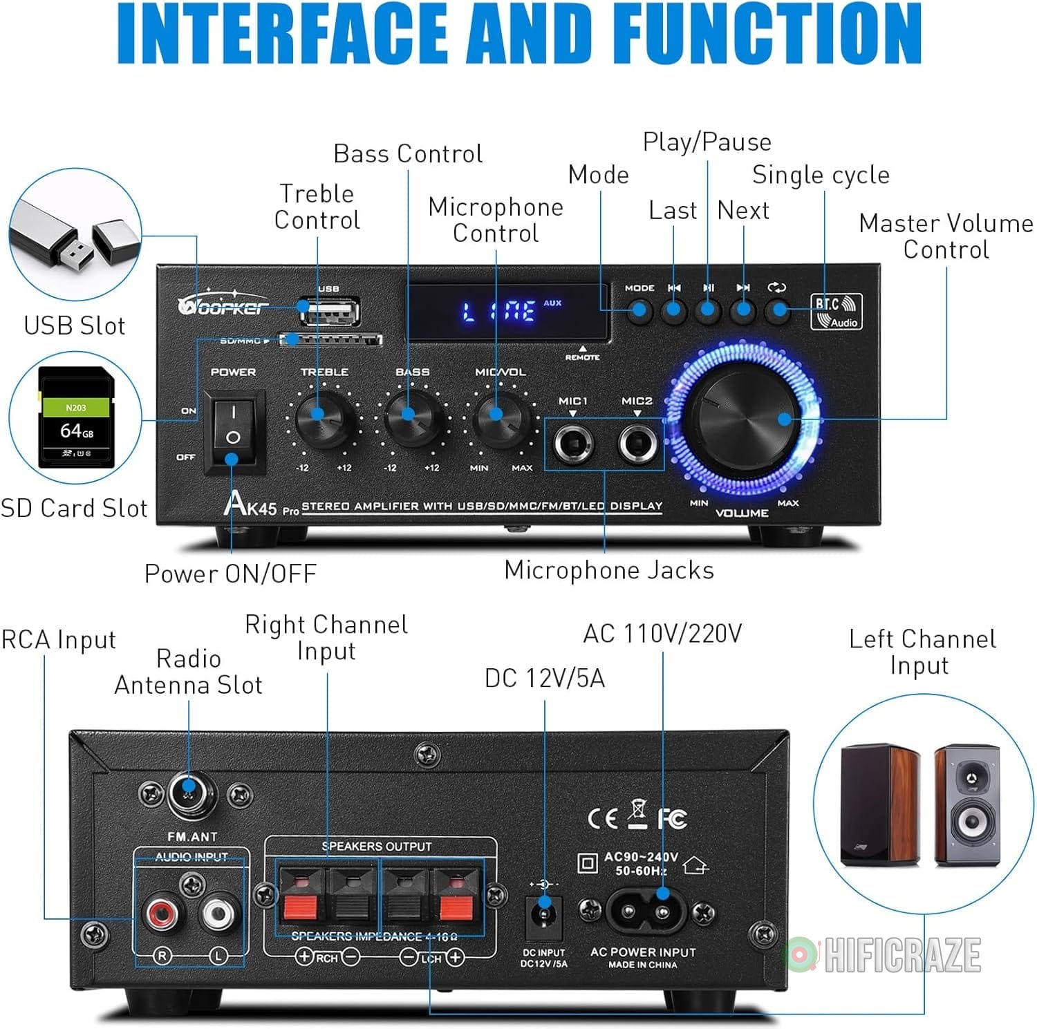 Specification: AK45 Pro Amplifier Home Audio Stereo Receivers with Bluetooth 5.0,Max 400W,2.0 Channel Stereo Amplifier System for Home Theater Speakers, Karaoke,Garage,Home Amp with USB,SD,RCA,2 MIC in