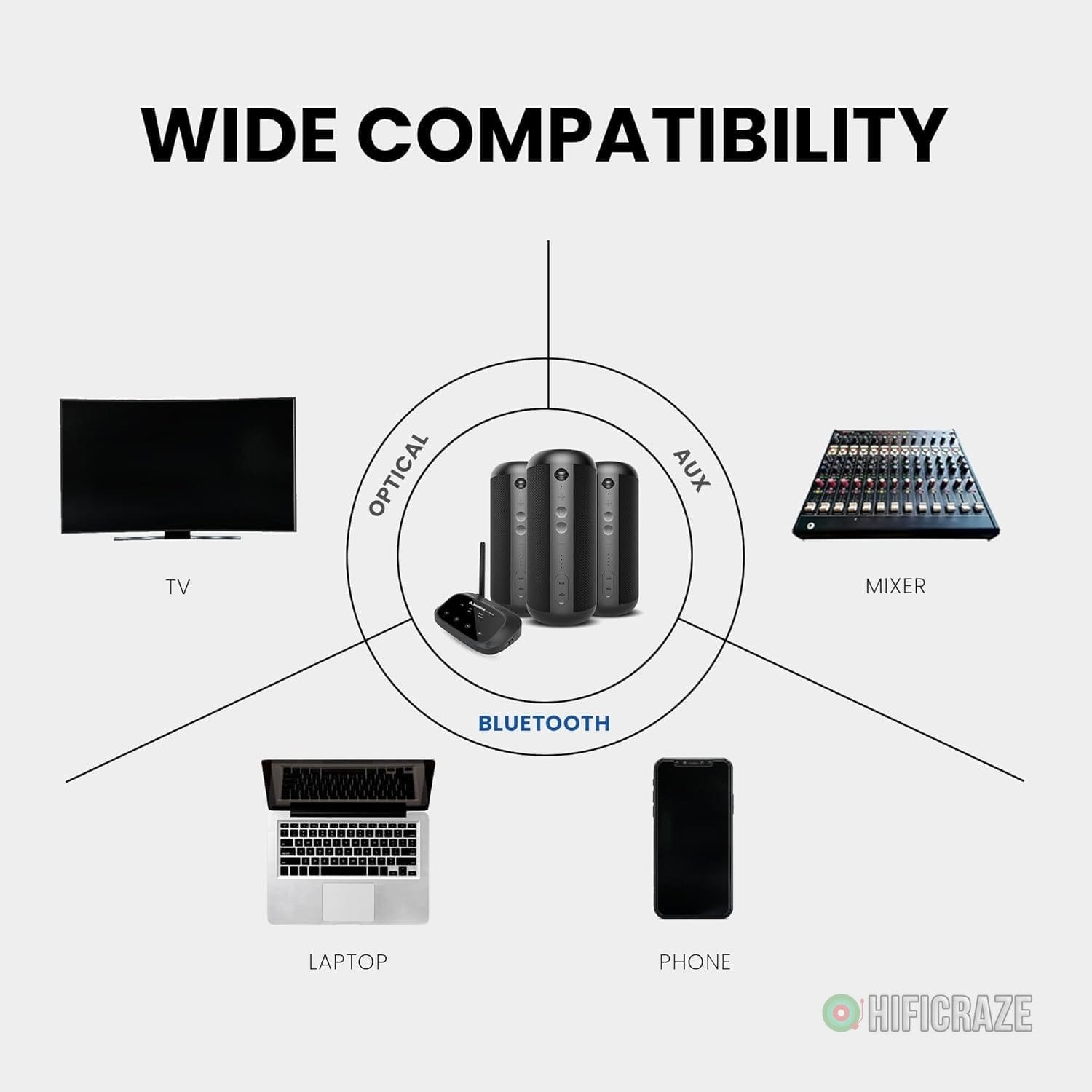 Setting up the Harmony 2 is a breeze. Simply connect the transmitter to your TV, phone, or laptop via Bluetooth, AUX, or optical input. Once powered on, the transmitter and speakers auto-connect—no pairing, no app, and no complicated configurations needed.
