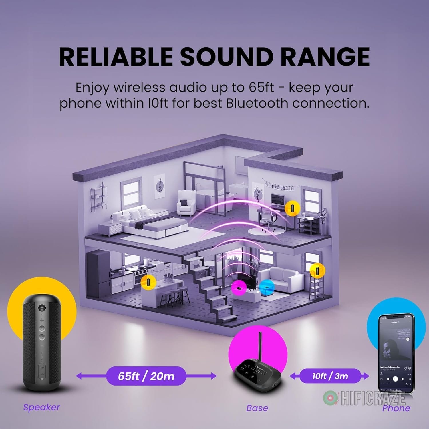 Experience seamless audio streaming across multiple speakers with under 30ms latency, ensuring perfect sync. The impressive range reaches up to 65 ft, making it ideal for various room layouts.