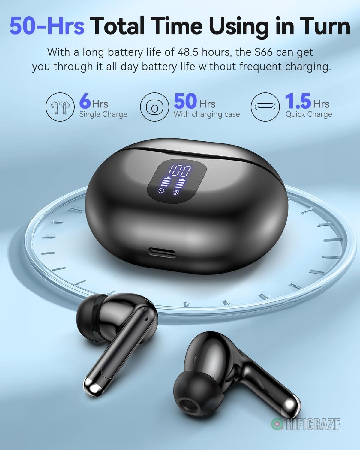 The earbuds offer a long battery life, boasting 6 hours of playtime on a single charge. The accompanying battery case extends total usage up to 50 hours. A quick 10-minute charge can provide an additional 2 hours of playtime, ensuring you stay connected longer.