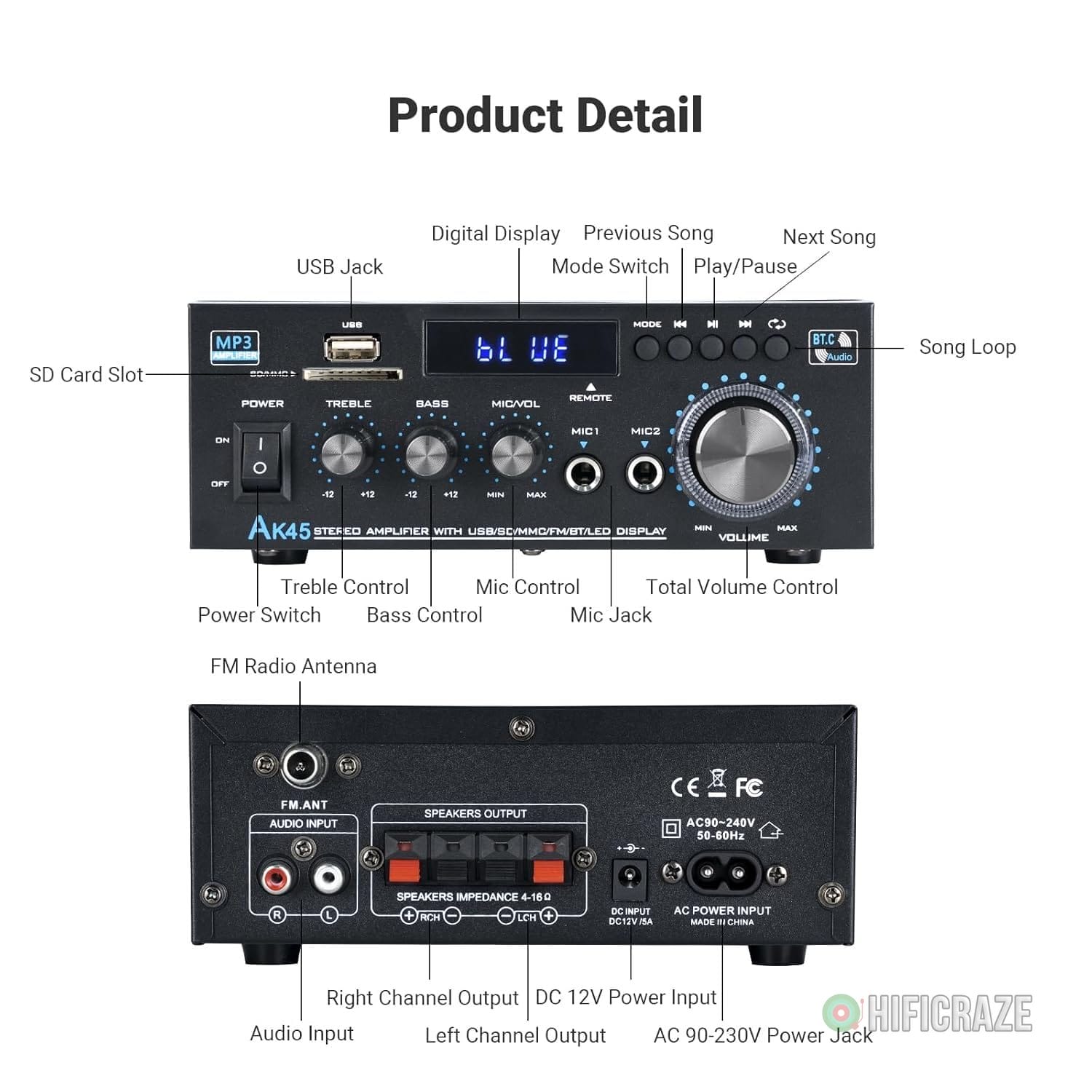 The NEOHIPO AK45 is designed for those who demand high-quality sound. With its upgraded design and 40W+40W rated power, it’s perfect for passive speakers and offers excellent sound clarity. The built-in Bluetooth 5.0 ensures seamless connectivity with minimal distortion.