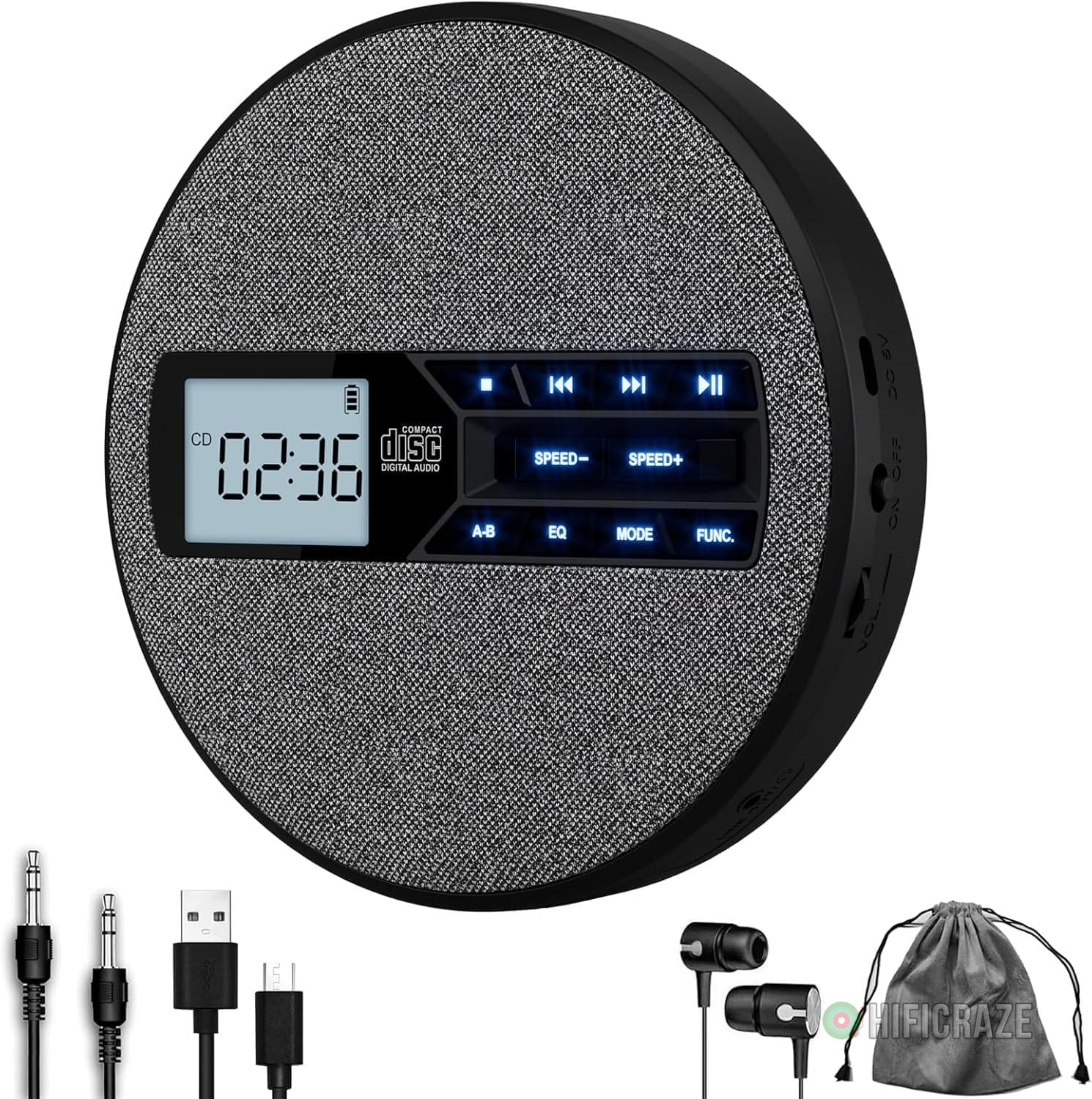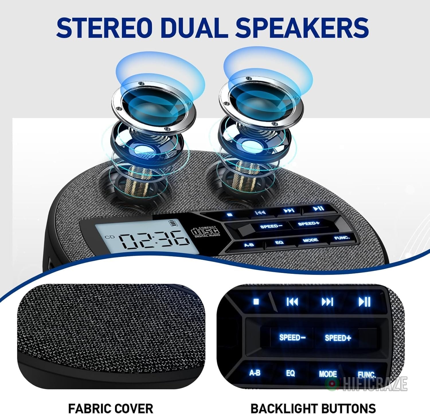 Specification: CD Player Portable, Rechargeable Portable CD Player with Dual Speakers and Anti Skip,CD,USB,AUX,LCD Display,Backlit Button,5 EQ,A-B Repeat,10 Speeds for Home Car Fabric Black