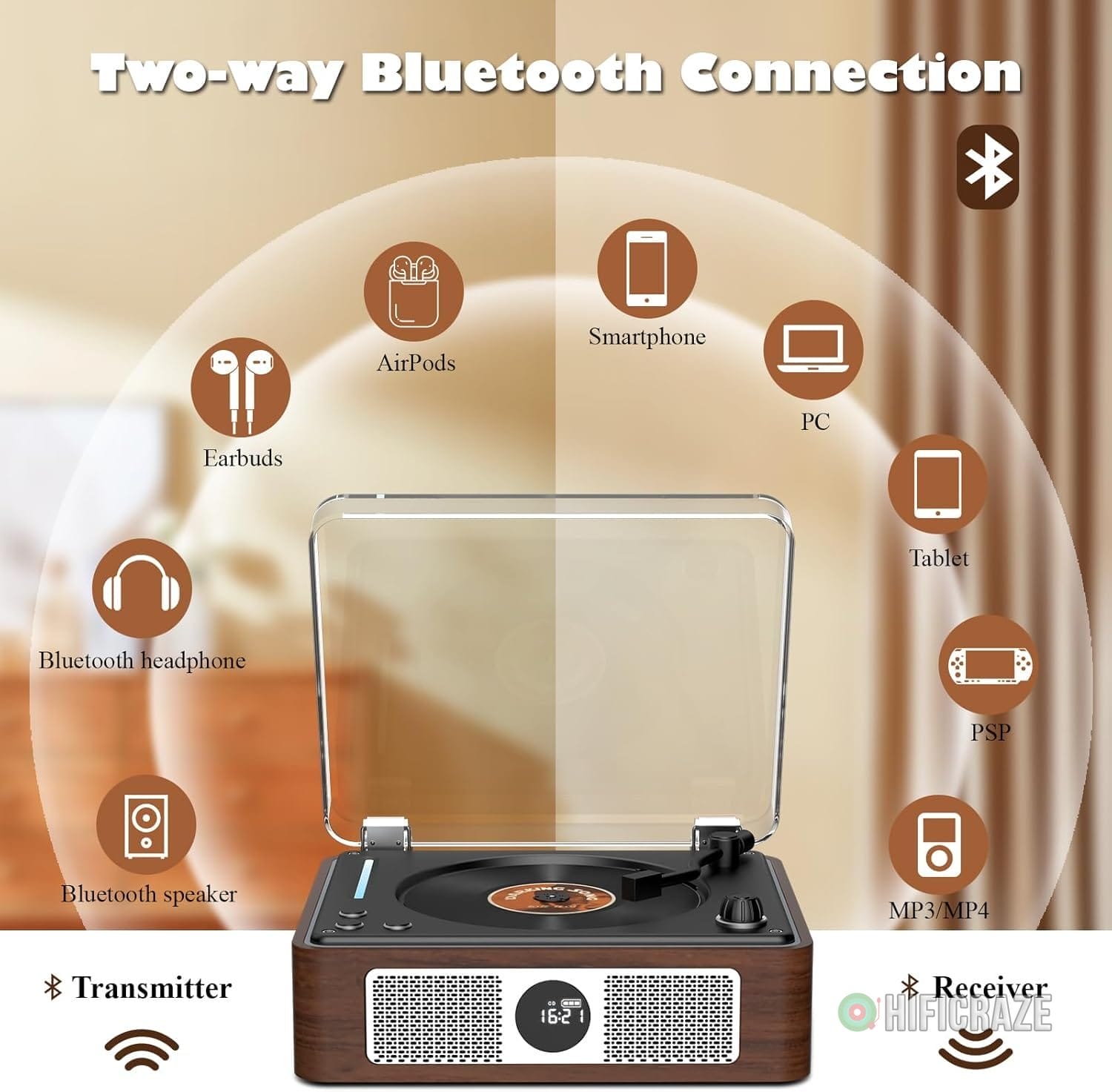 - Bluetooth Connectivity: Acts as both a transmitter and receiver; connect Bluetooth headphones or speakers.