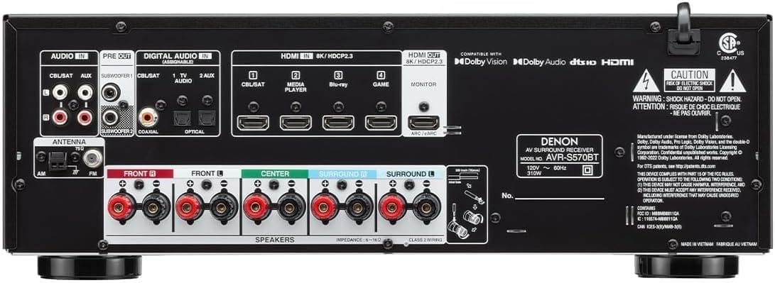 Specification: Denon AVR-S570BT 5.2 Channel AV Receiver – 8K Ultra HD Audio & Video, Enhanced Gaming Experience, Wireless Streaming via Built-in Bluetooth, (4) 8K HDMI Inputs, Supports eARC, HD Setup Assistant