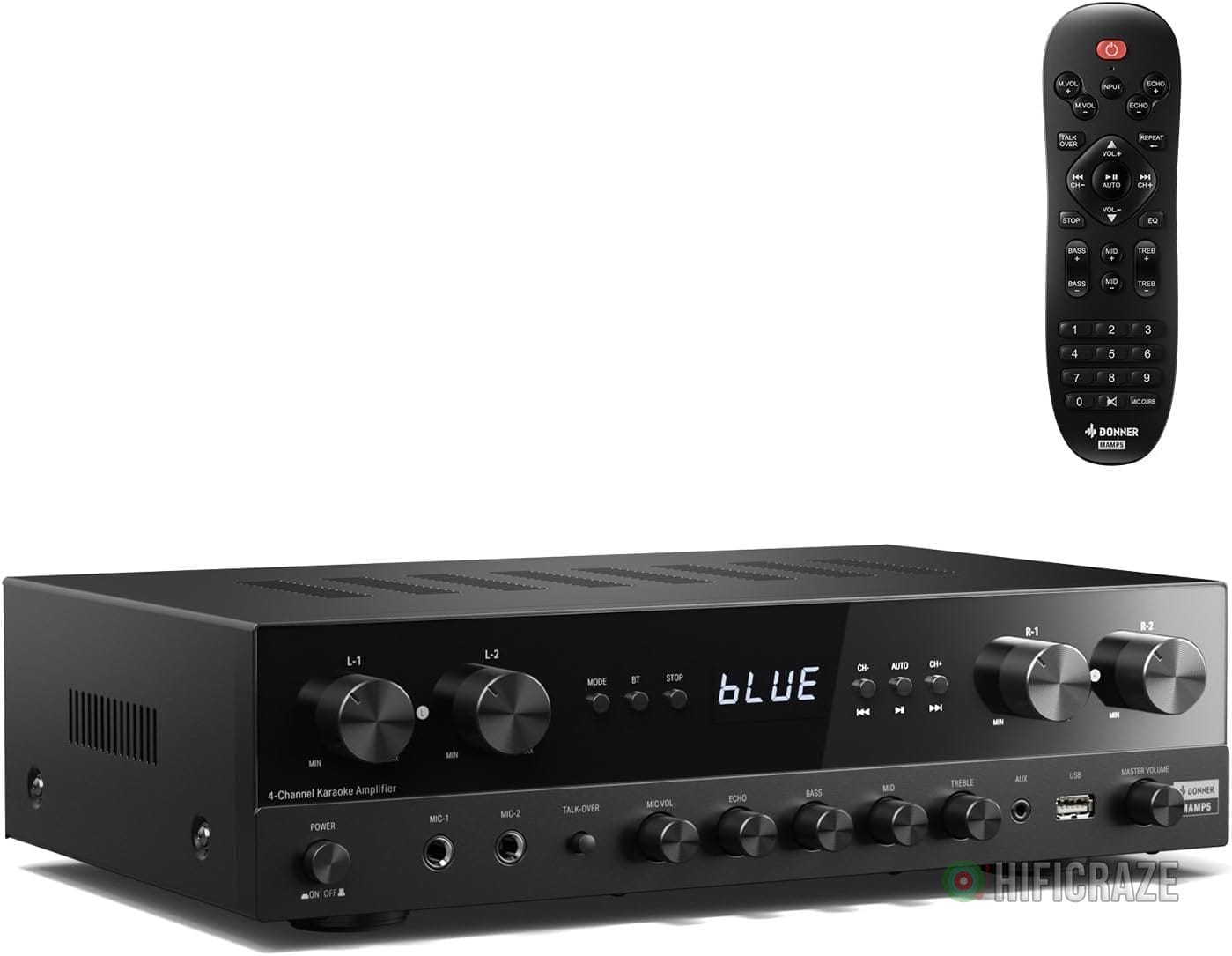 Specification: Donner Stereo Receivers Home Audio Amplifier, Premium 1000W Peak Power 4 Channel Amplifier with Bluetooth 5.0, USB, FM, 2 Mic-in, Echo, RCA, Optical/Coaxial Input for Home, Karaoke, Theater Speakers