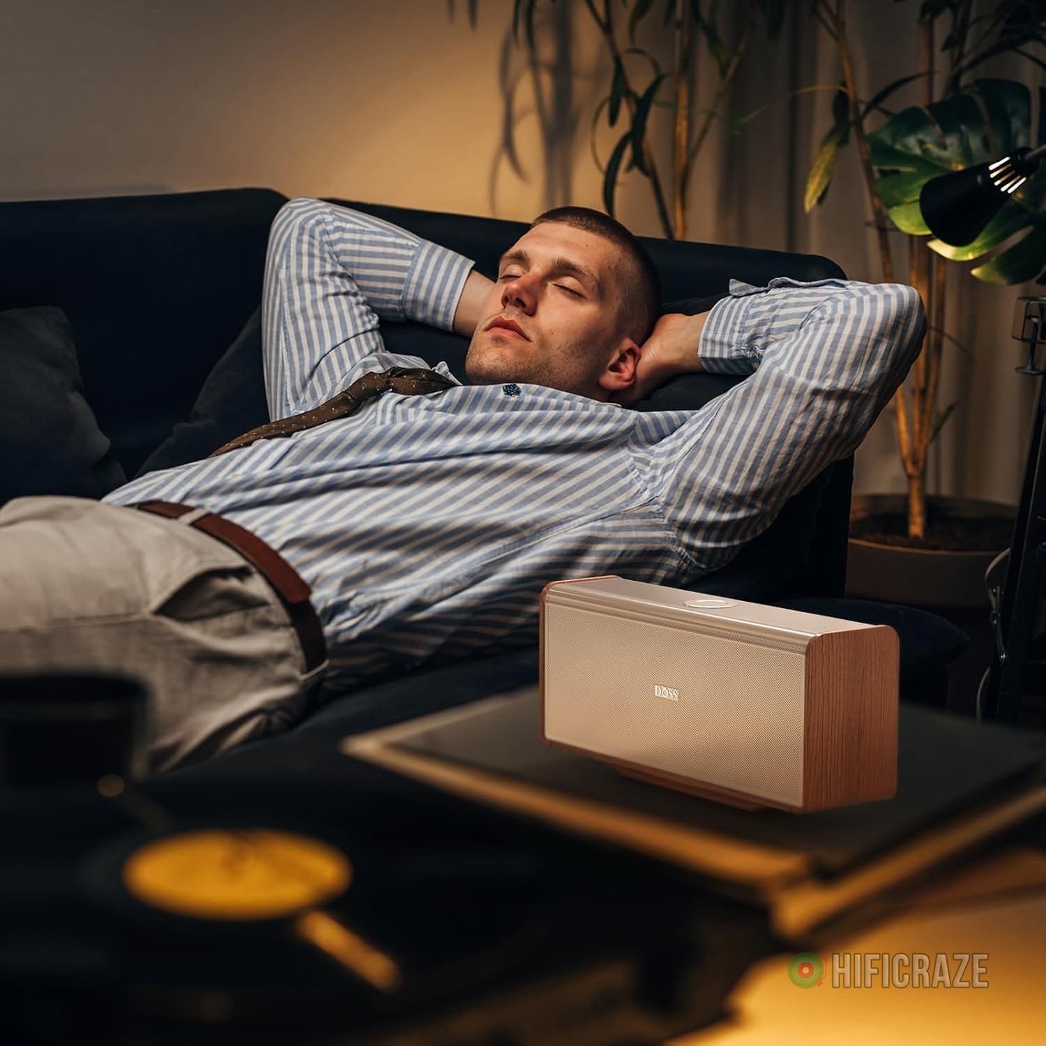 The speaker boasts a premium metal body with a faux wood grain texture, providing a modern yet classic look. Its compact design makes it easy to place on any surface, be it your kitchen counter, living room, or office desk.