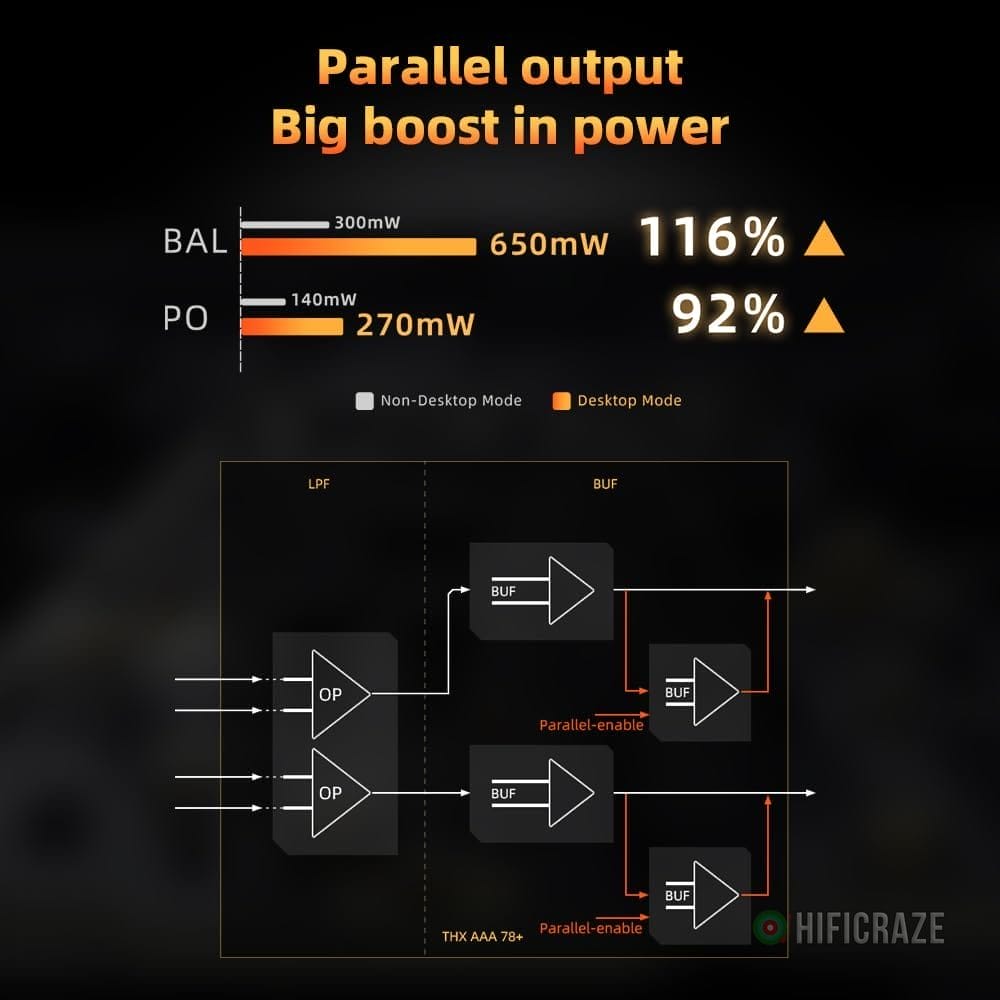 – **Desktop Mode**: Operates efficiently with a single-end output power of up to 270mW + 270mW and balanced output power of 650mW + 650mW when powered by USB.