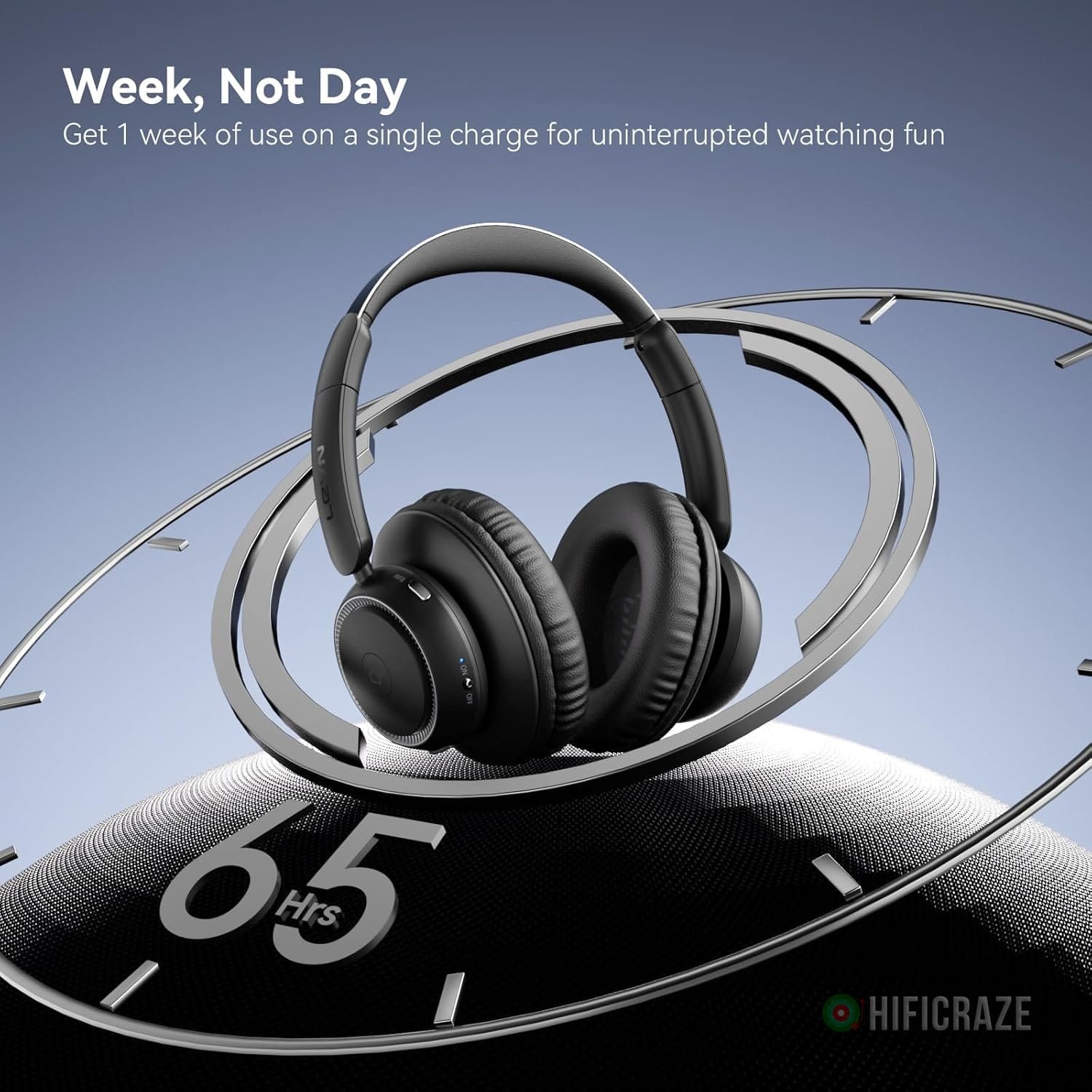 Enjoy uninterrupted movie marathons with the LEVN wireless headphones’ impressive battery life, lasting up to 65 hours on a single charge. You can indulge in lengthy viewing sessions without the fear of running out of battery. When it’s time to recharge, simply place the headphones on the TV transmitter for hassle-free power replenishment—no cables involved.