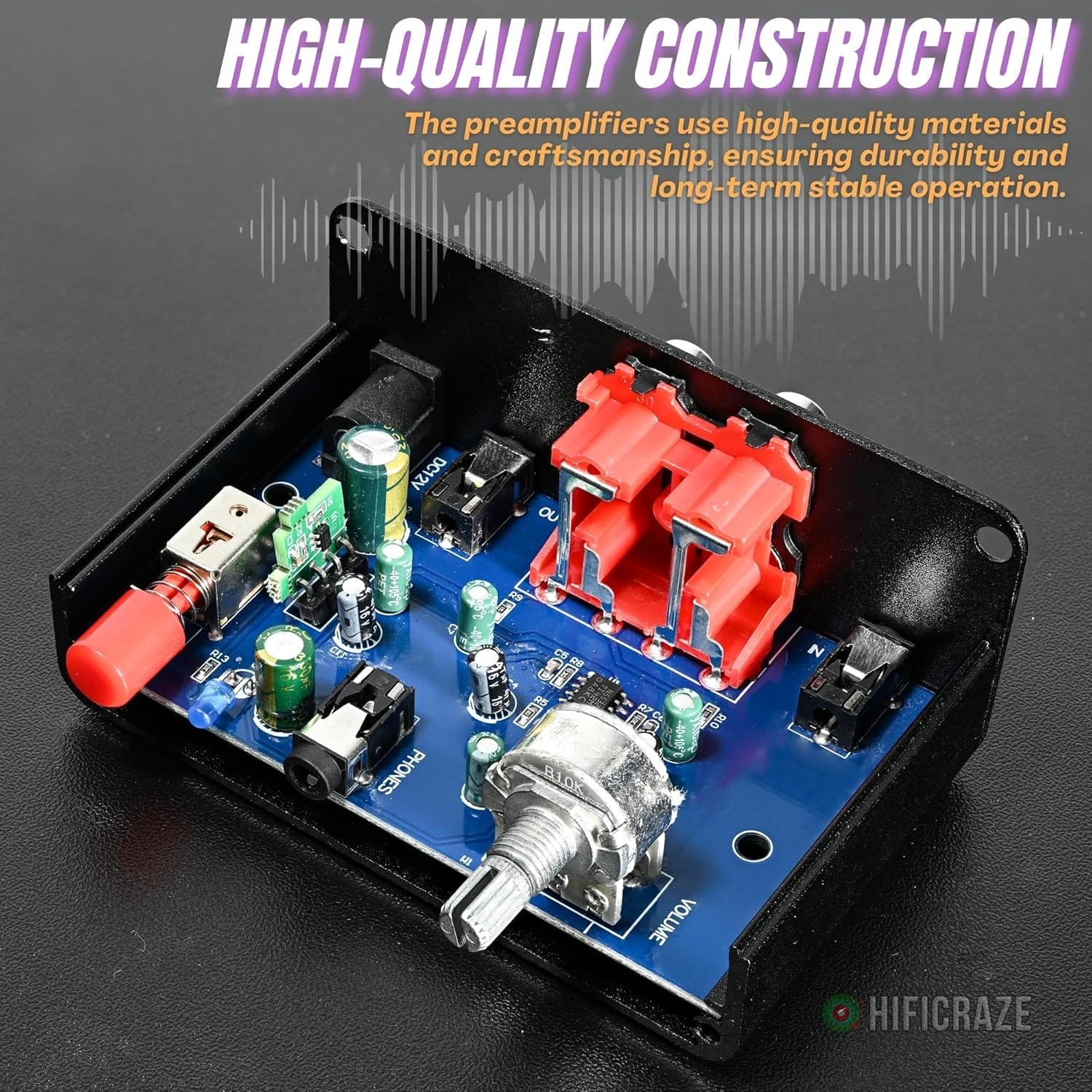 Specification: Phono Preamp, Mini Stereo Audio Preamplifier, Headphone Amplifier, Phonograph Preamp for Turntable Pre amp, Gain 20dB, Dual OP AMP NE5532, RCA 3.5mm Input to RCA 3.5mm Output