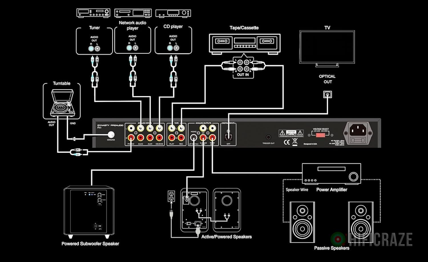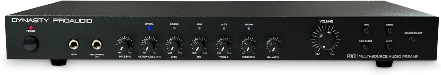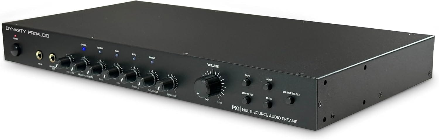 The Dynasty ProAudio PX1 is a high-performance stereo preamplifier designed to enhance your audio experience. It connects seamlessly with multiple analog and digital sources, making it ideal for home audio setups.