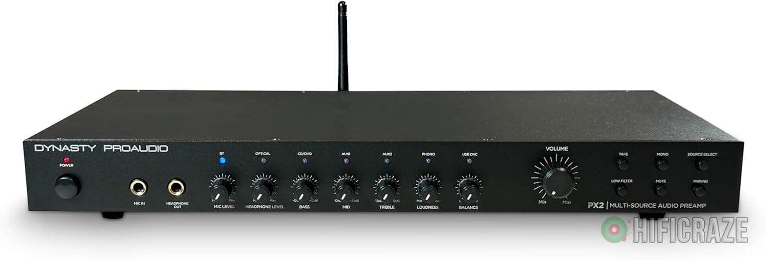 The Dynasty ProAudio PX2 is a high-performance stereo preamplifier designed for exceptional sound quality. It is equipped for versatile use, allowing integration with various sound sources, including Bluetooth 5.3 and USB DAC capabilities.