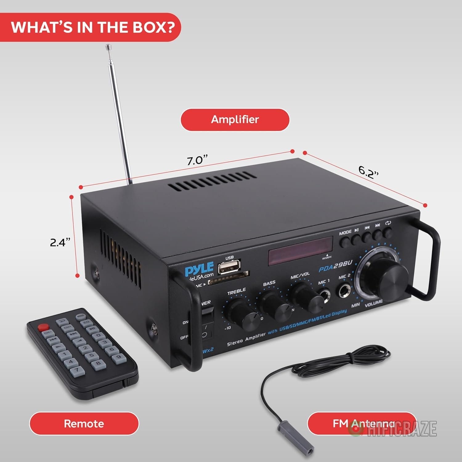 Specification: Pyle 200W Stereo Power Amplifier with Bluetooth – Dual Channel Audio Receiver – LED Display – RCA – USB – SD – MIC IN – FM Radio – AUX Input – Perfect for Home & Computer Audio – PDA29BU.5
