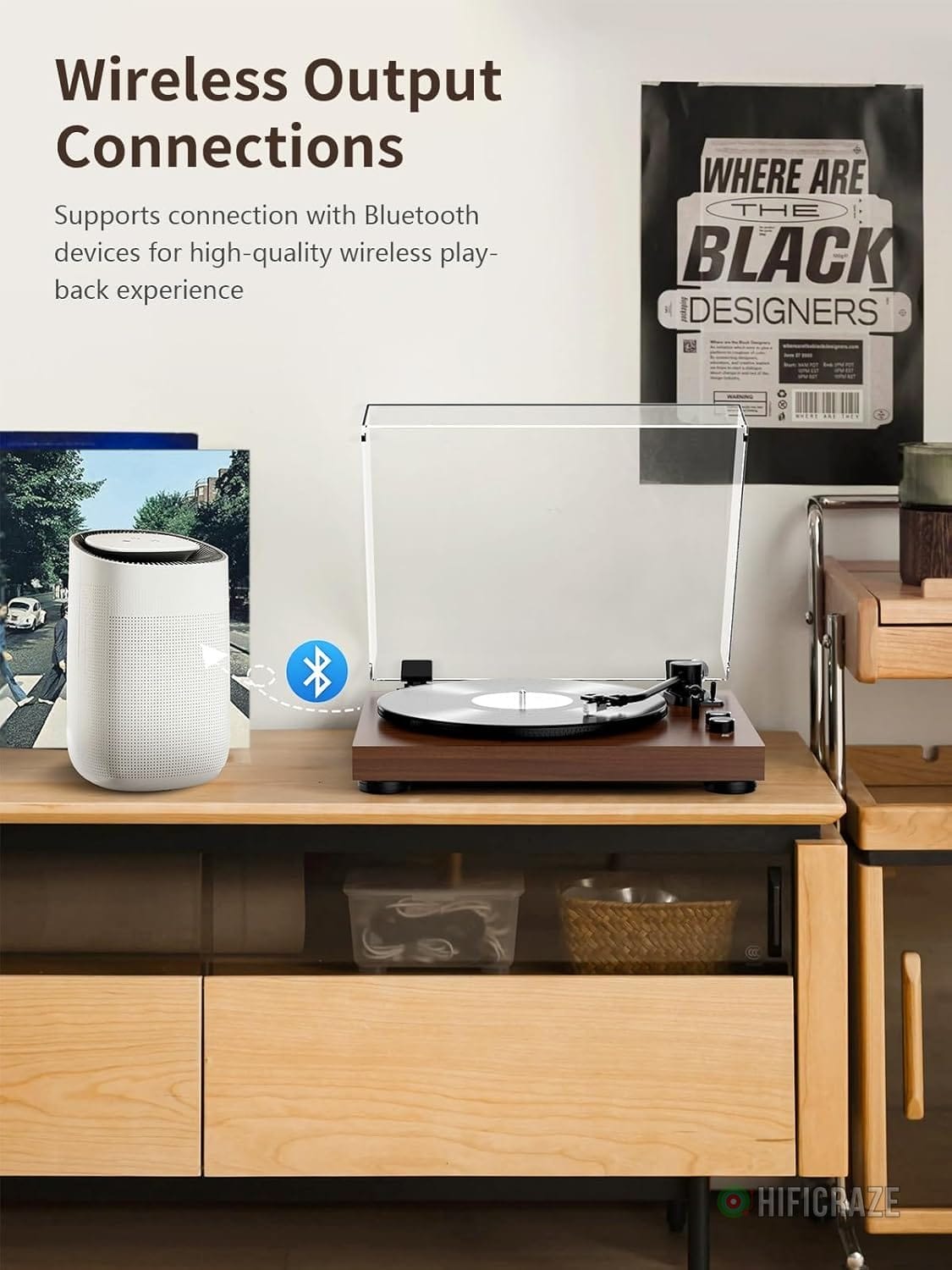 Specification: Record Player Belt-Drive Turntable with Bluetooth Output Connectivity Support 2 Speeds (33&45RPM) RCA Output Line Vinyl Record Player with Magnetic Cartridge Built-in Phono Pre-amp