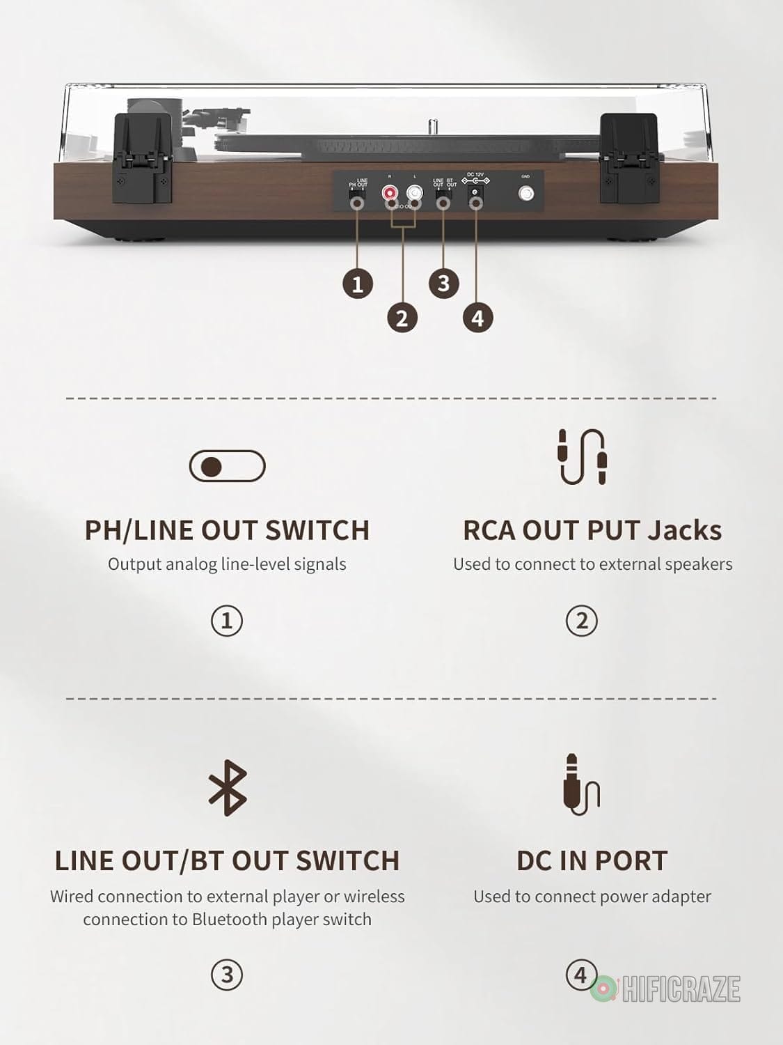 - Built-in Phono Preamp: Switchable Phono and Line output modes for versatile playback options.