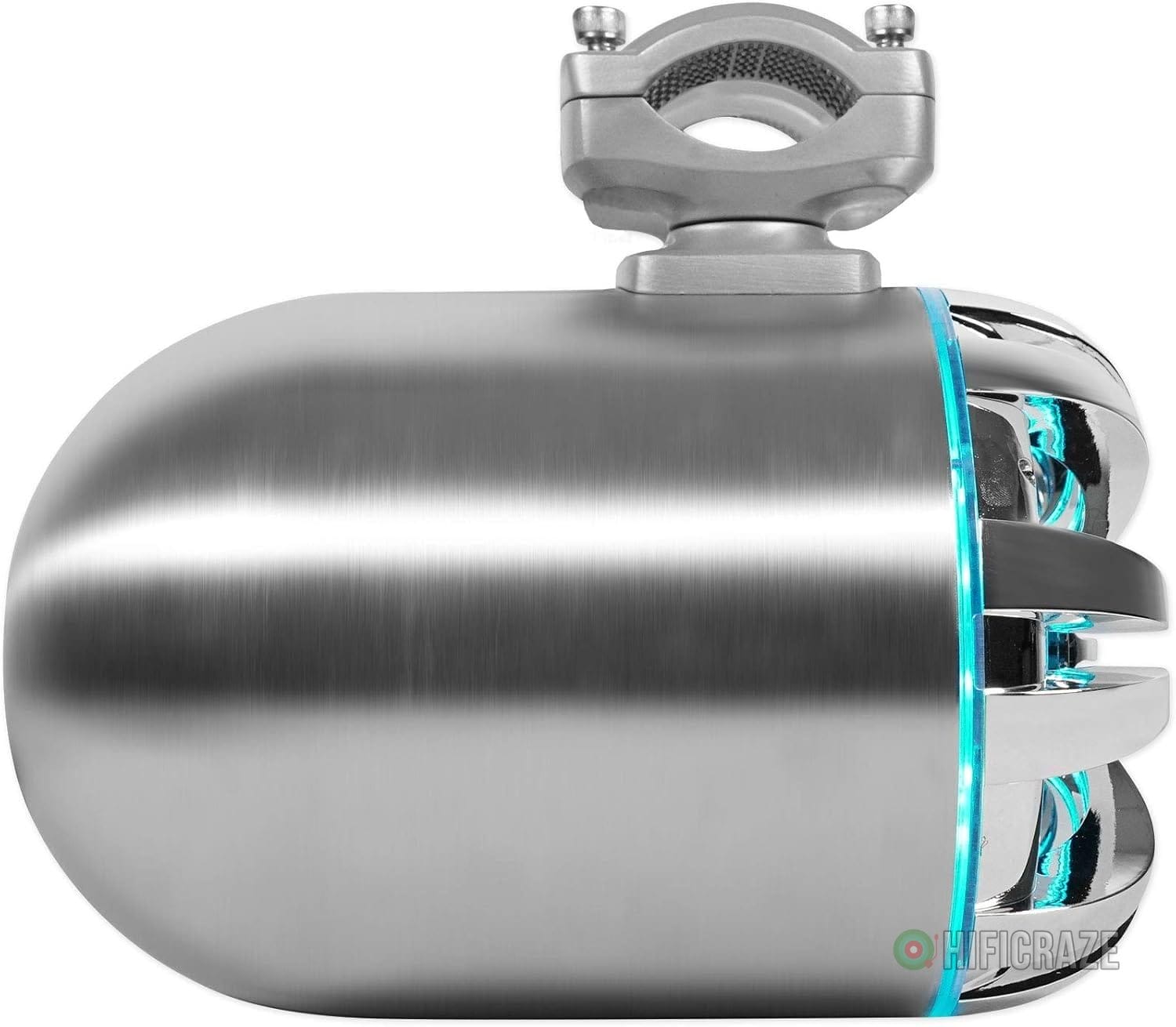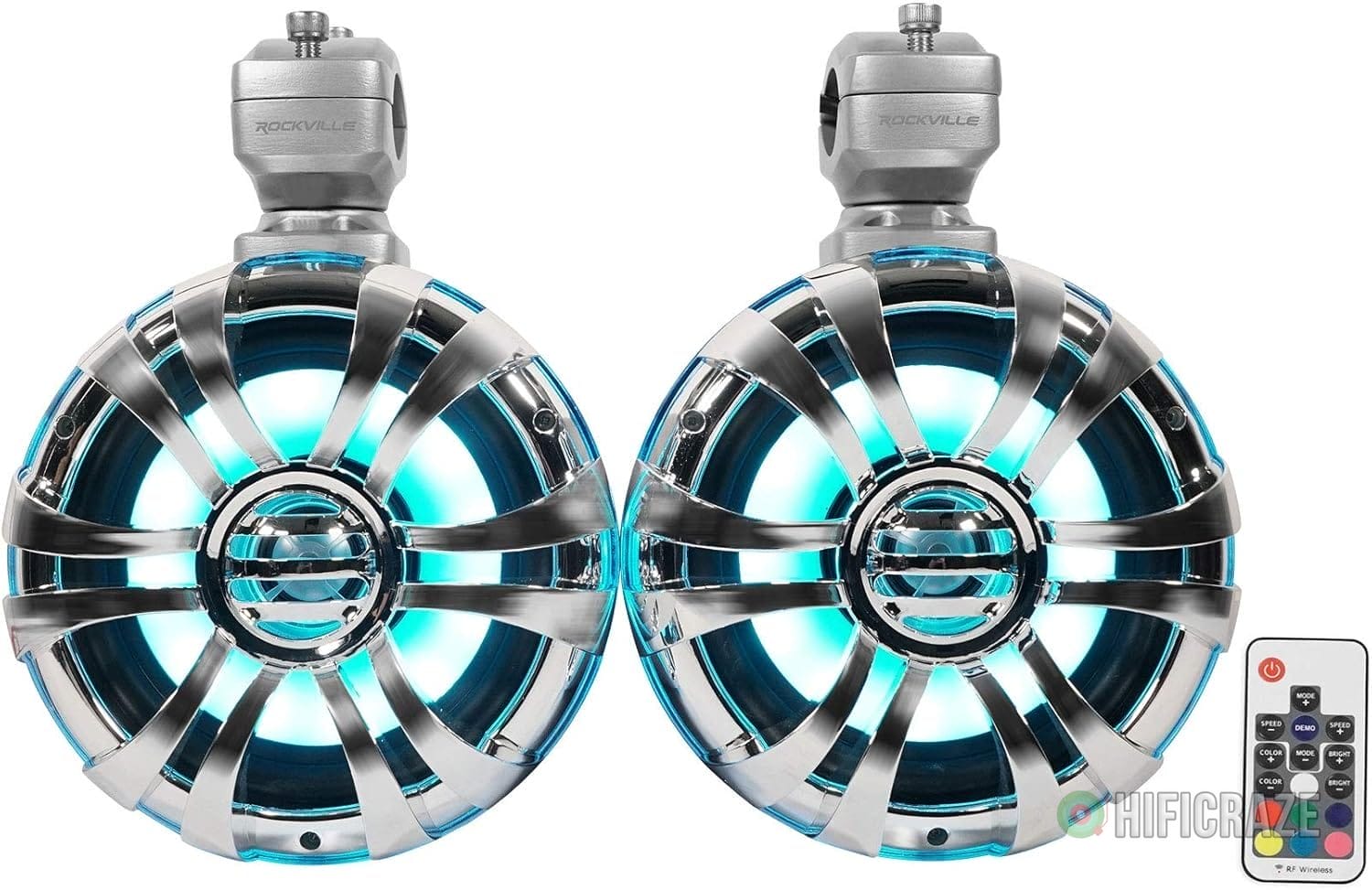 Specification: Rockville WB65KLED 600W Peak/300W RMS Marine Wakeboard Tower Speakers Pair, 6.5″, Built-in LED Lights, 360 Degree Swivel, Waterproof, 4 Ohm, for Boats, Jeeps, and ATVs