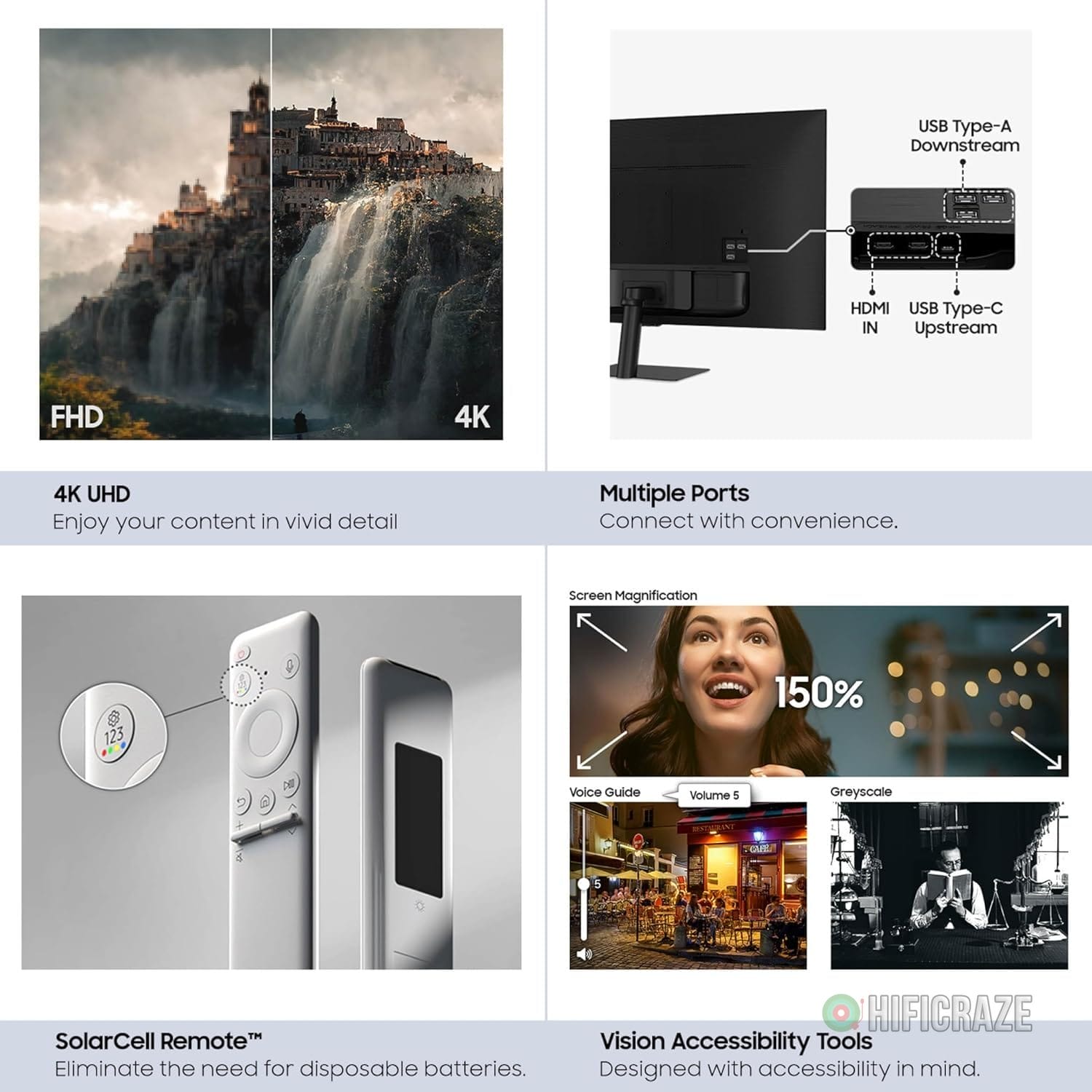 Specification: SAMSUNG 32-Inch M7 (M70D) Series 4K UHD Smart Monitor with Streaming TV, Speakers, HDR10, USB-C, Multiple Ports, Gaming Hub, SolarCell Remote, Vision Accessibility Tools, LS32DM702UNXGO, 2024, Black