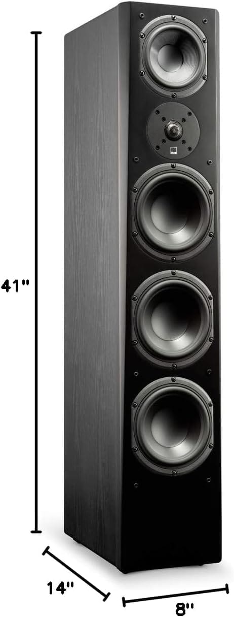 - Dimensions: 41.1″ (H) x 8″ (W) x 13.9″ (D) including grille, feet, and binding posts