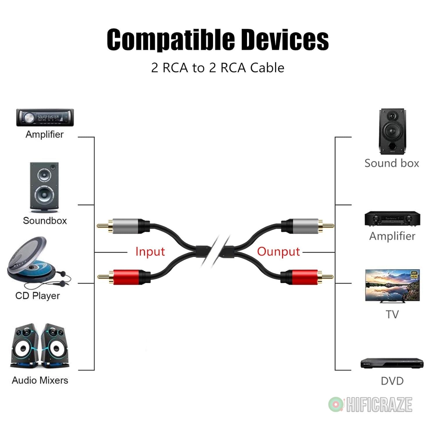 This high-quality 2RCA to 2RCA audio cable offers reliable and clear audio signal transmission, making it an excellent choice for connecting devices such as stereos, amplifiers, DVD players, and TVs.