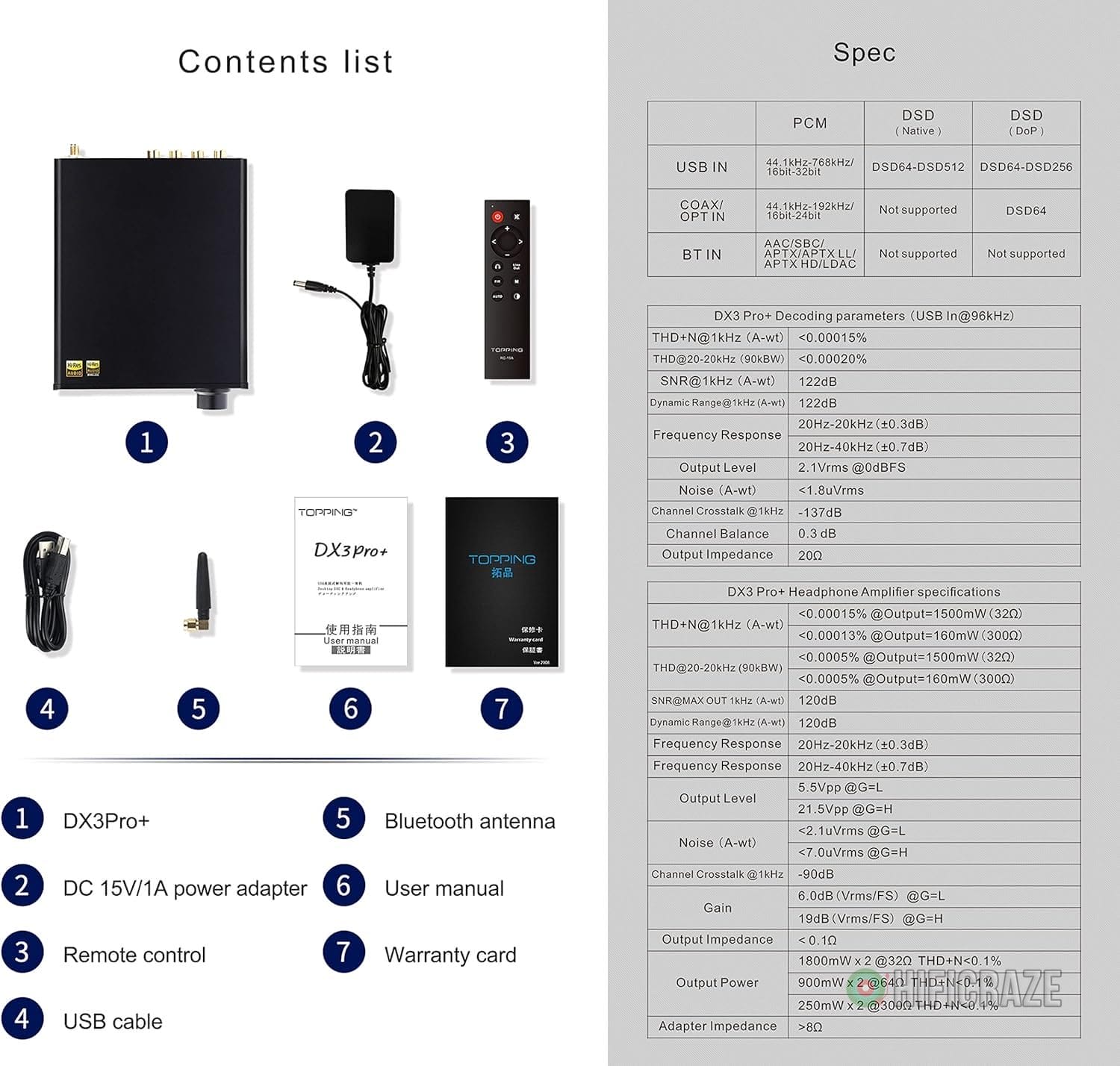 Specification: Topping DX3pro+ LDAC Headphone Amplifier – ES9038Q2M XU208 NFCA Bluetooth5.0 Audio Decoder USB/Opt/Coax DAC AMP Pre Amplifier with Remote Control (Black)