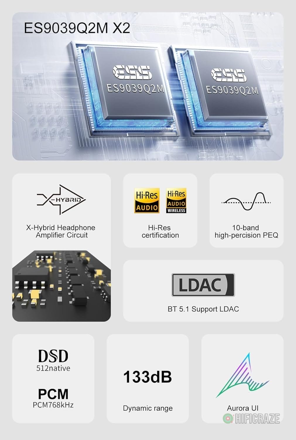 The DX5 II features dual ESS9039Q2M DAC chips, ensuring top-notch audio fidelity with ultra-low distortion and noise. Supporting PCM768kHz/32bit and DSD512 decoding, it offers true audiophile-grade performance.