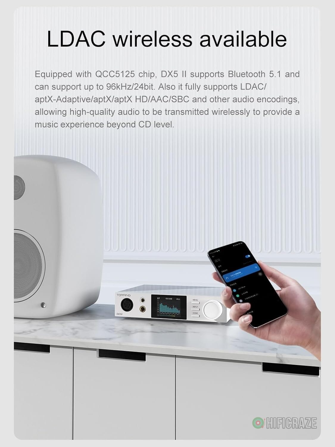 The DX5 II supports Bluetooth 5.1 with codecs like LDAC, aptX Adaptive, and AAC, ensuring high-quality wireless audio transmission beyond CD level. The inclusion of the QCC5125 chip enhances streaming capabilities.