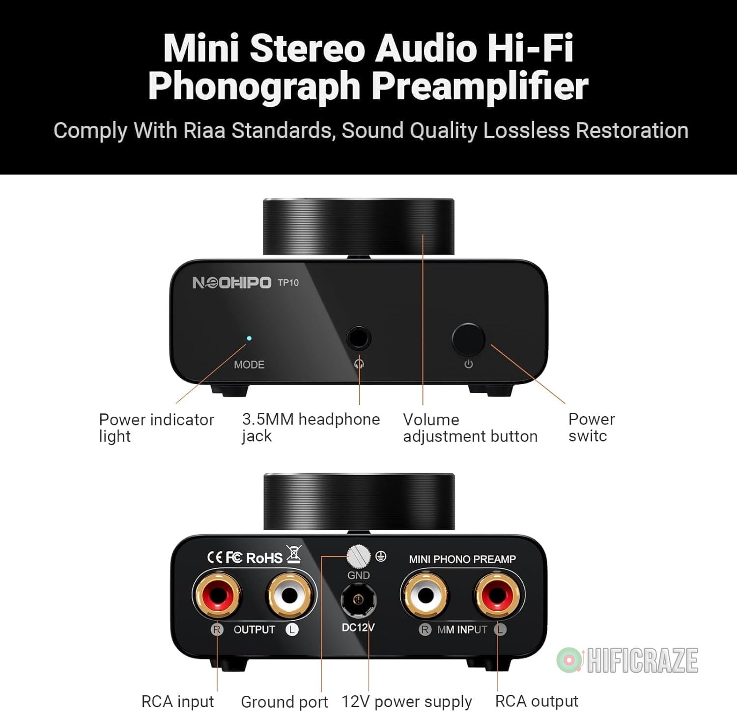 The NEOHIPO TP10 Phono Preamp is a mini stereo audio Hi-Fi phonograph preamplifier that delivers excellent sound quality, powered by a DC 12V power supply. With RCA input and RCA/3.5mm output, it offers versatile connectivity for your turntable.