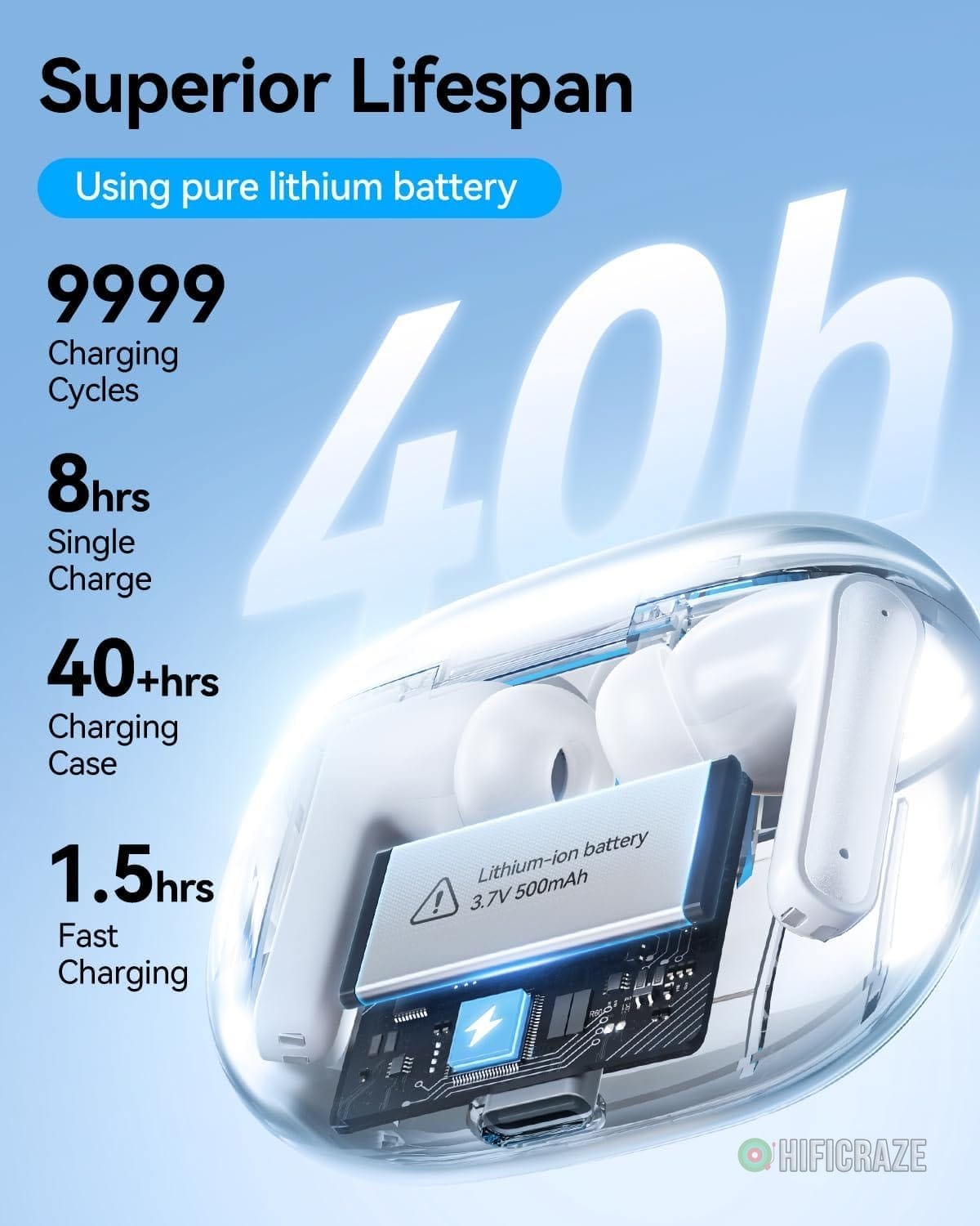 The earbuds promise a long playtime of up to 40 hours, providing 8 hours of continuous use per charge, plus an additional 32 hours from the charging case. A quick 10-minute charge delivers 1.5 hours of playtime, ensuring uninterrupted listening.