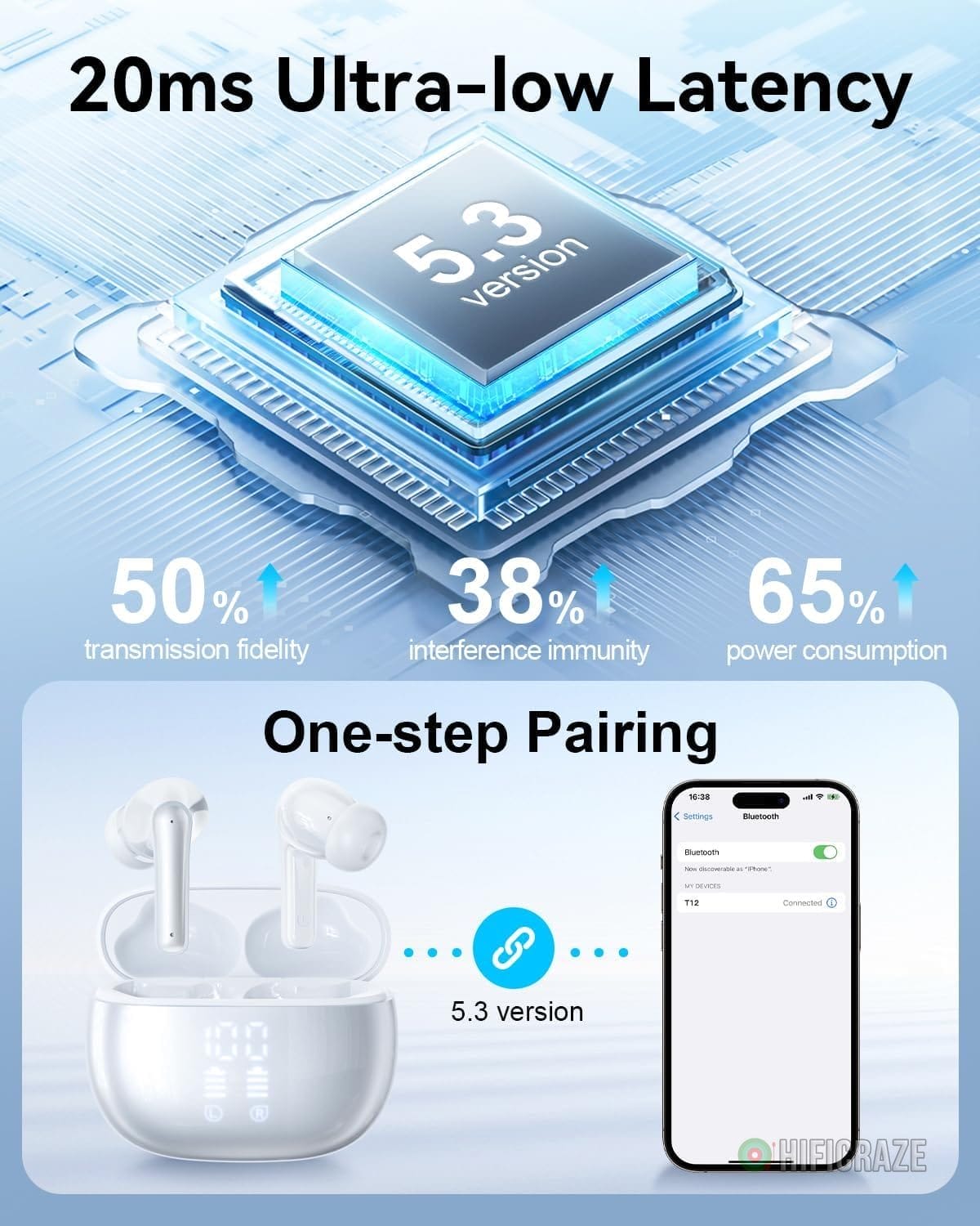 Utilizing Bluetooth 5.3 technology, the T12 earbuds ensure ultra-fast pairing and wide compatibility with various devices, including iOS and Android smartphones. The low power consumption feature enhances battery longevity while minimizing delays and disconnection issues.